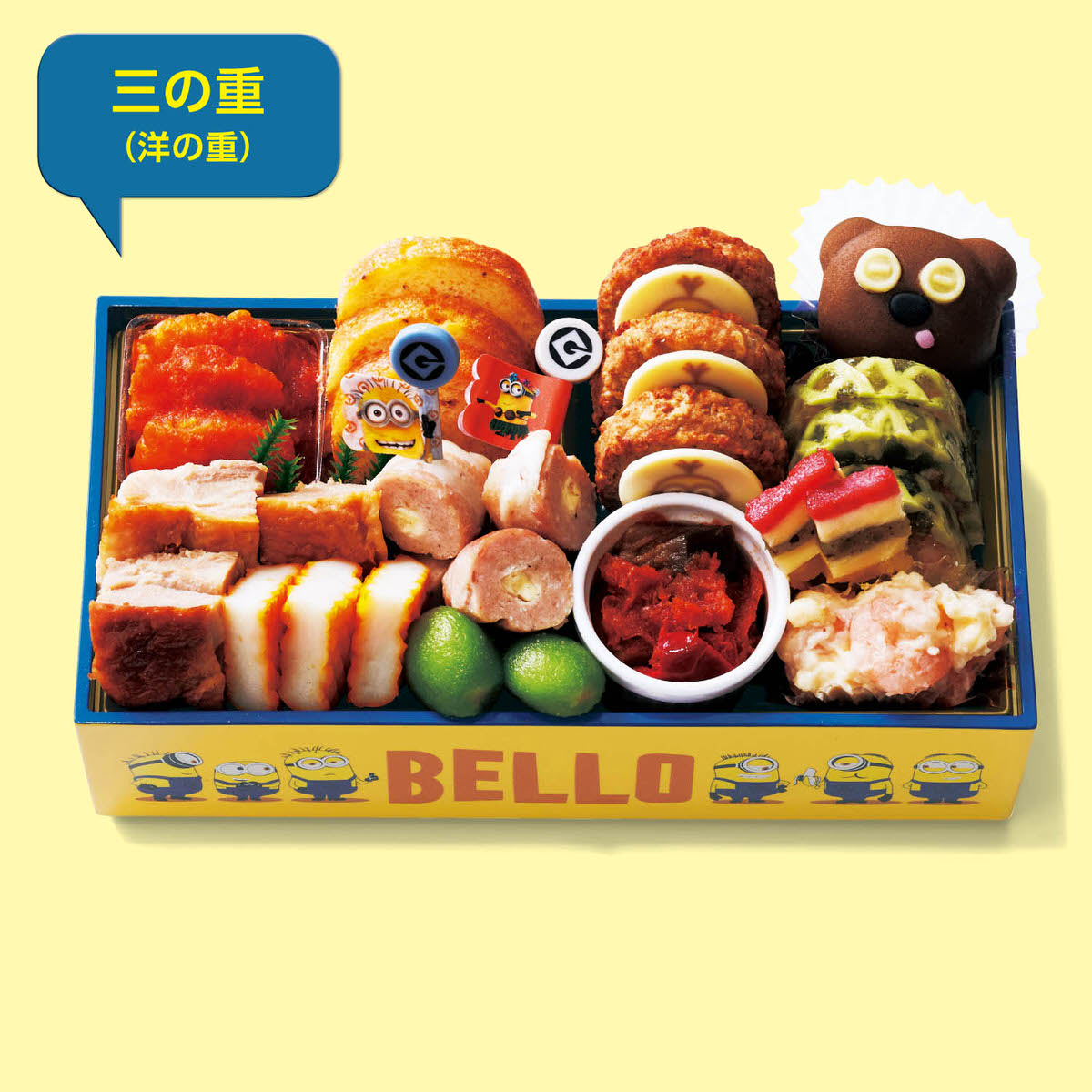 「ミニオン」たちが大集合したポップな三段重には、和のおせちと洋のおせちがギュッと詰まっています。