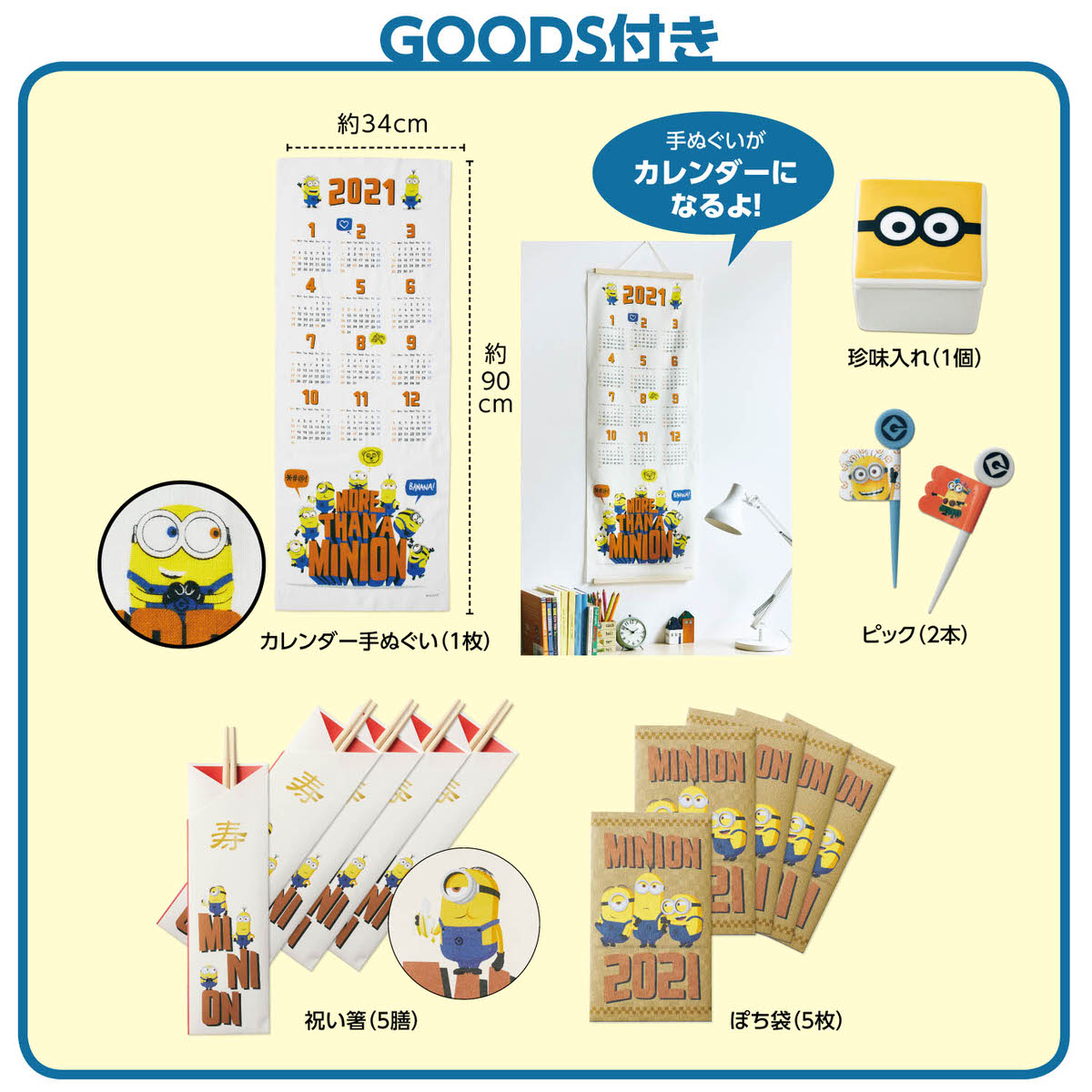 ほかにも、2021年のカレンダーになっている「オリジナル手ぬぐい」や、祝い箸、ぽち袋などが付いています!