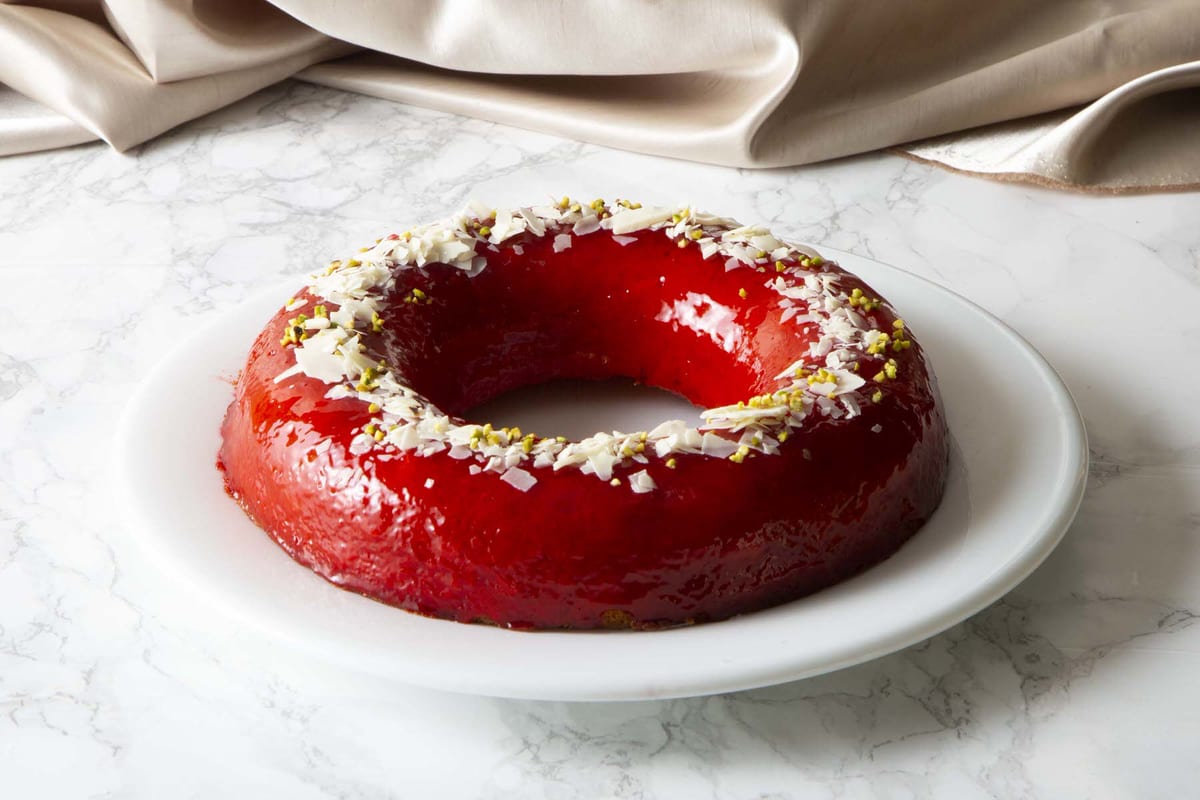 真っ赤なフランボワーズと白いライチのコントラストが美しい「ライチとローズフランボワーズムース」