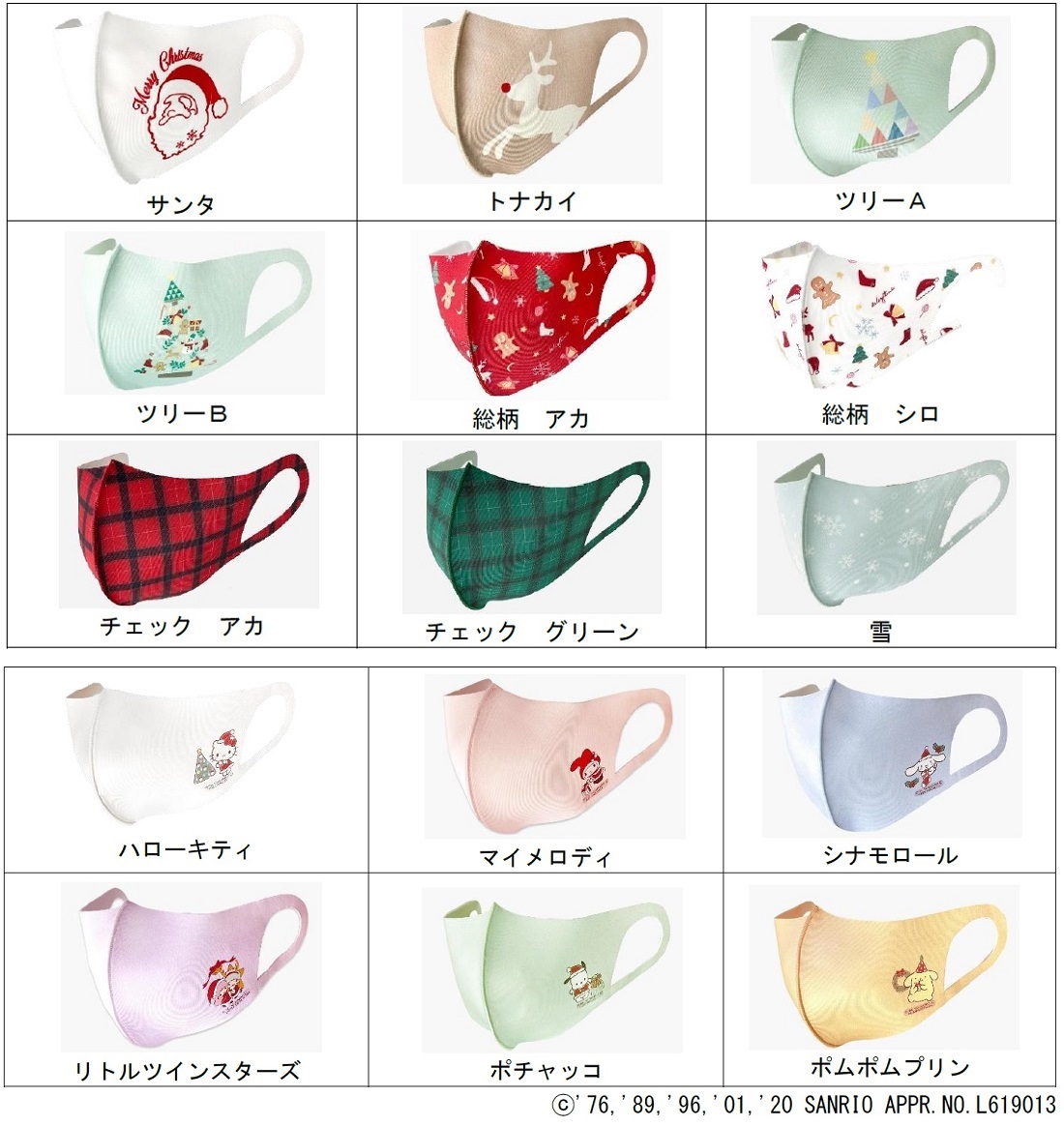 「ハローキティ」「マイメロディ」「シナモロール」「リトルツインスターズ」「ポチャッコ」「ポムポムプリン」が、クリスマスにぴったりのおめかしをした、かわいいマスクです☆