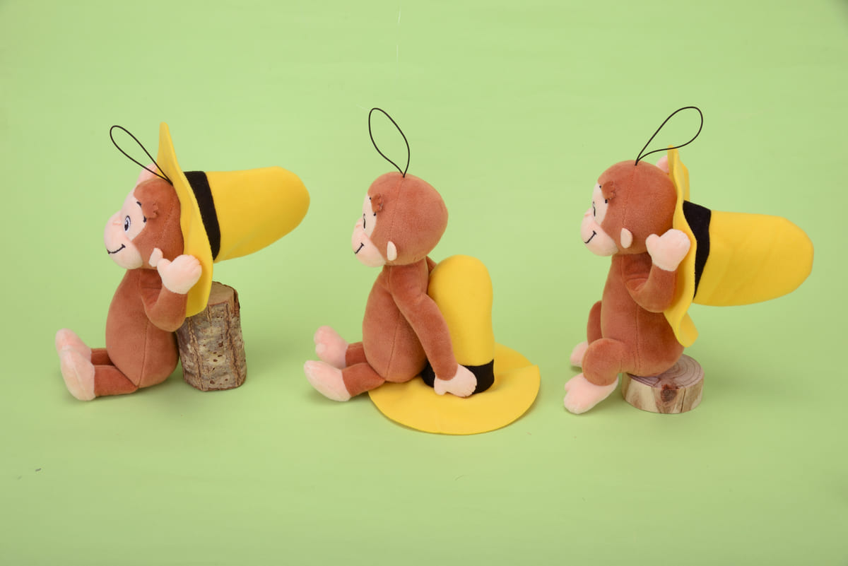 帽子を被ったり、帽子に座ったりと、元気なポーズの「ジョージ」がそろっています!