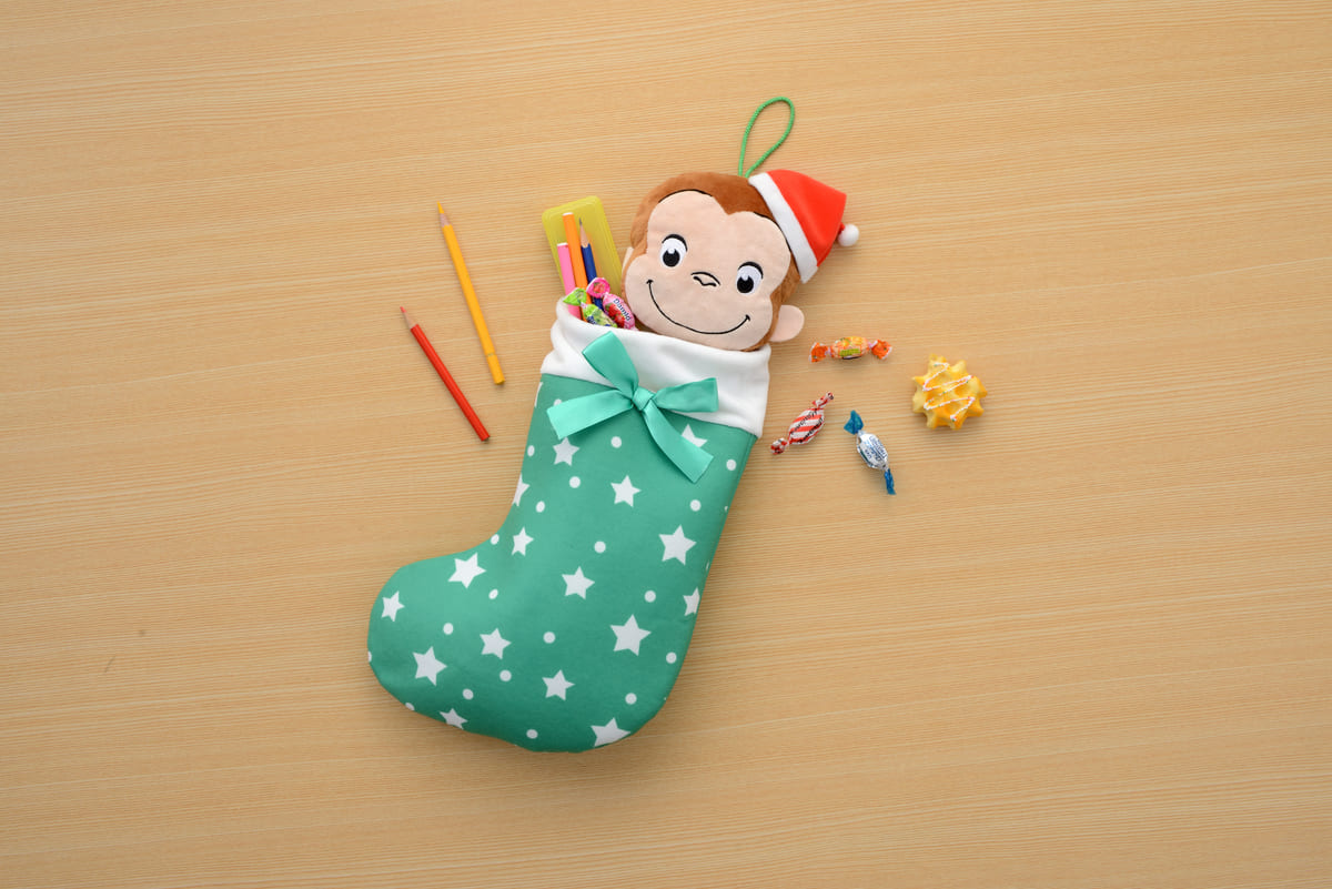 クリスマスにぴったりの「プレミアム大きなソックス小物入れ」は、「ジョージ」が顔を出した可愛いデザイン。