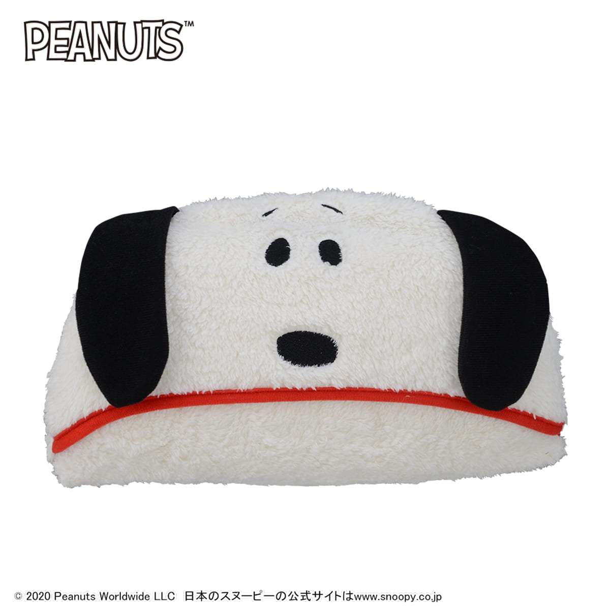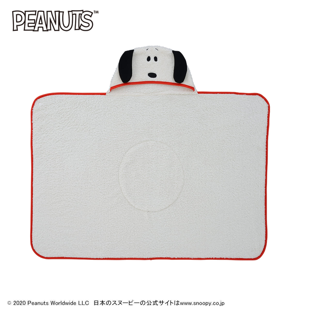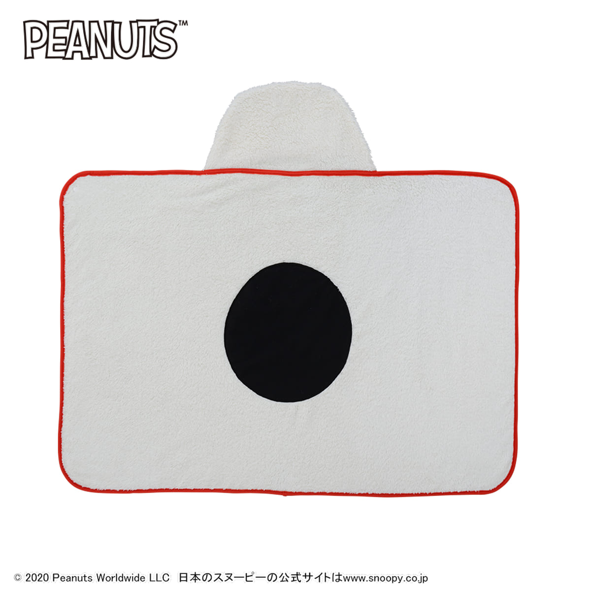スヌーピーのお顔のフードがついた、もこもこのあったかブランケット。