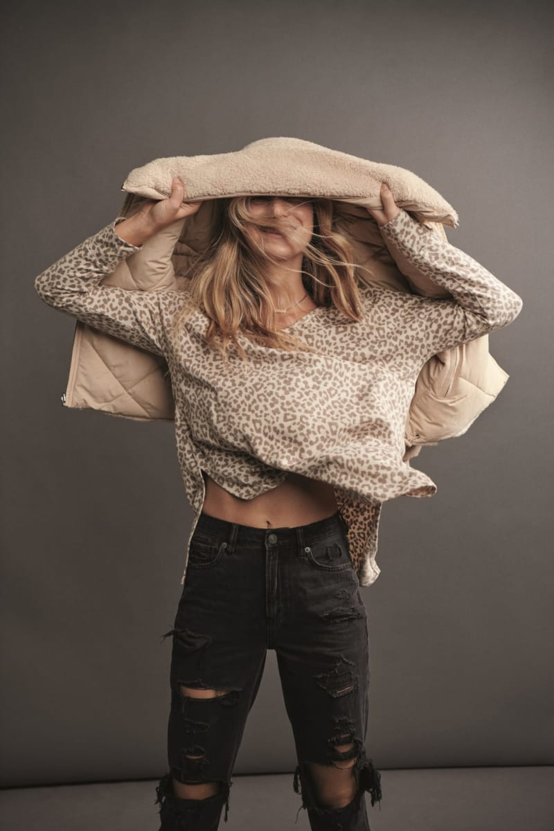 トレンドカラーの「ヘザーグレイ」と「バーガンディー」は「ホリデー 2020 コレクション」を一新し、ファジーなバーガンディーとアメリカンイーグルのアイコンアイテムであるクルーネックトップスを合わせることで、フレッシュで遊び心のあるスタイルを演出。