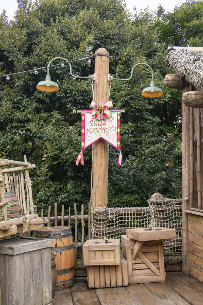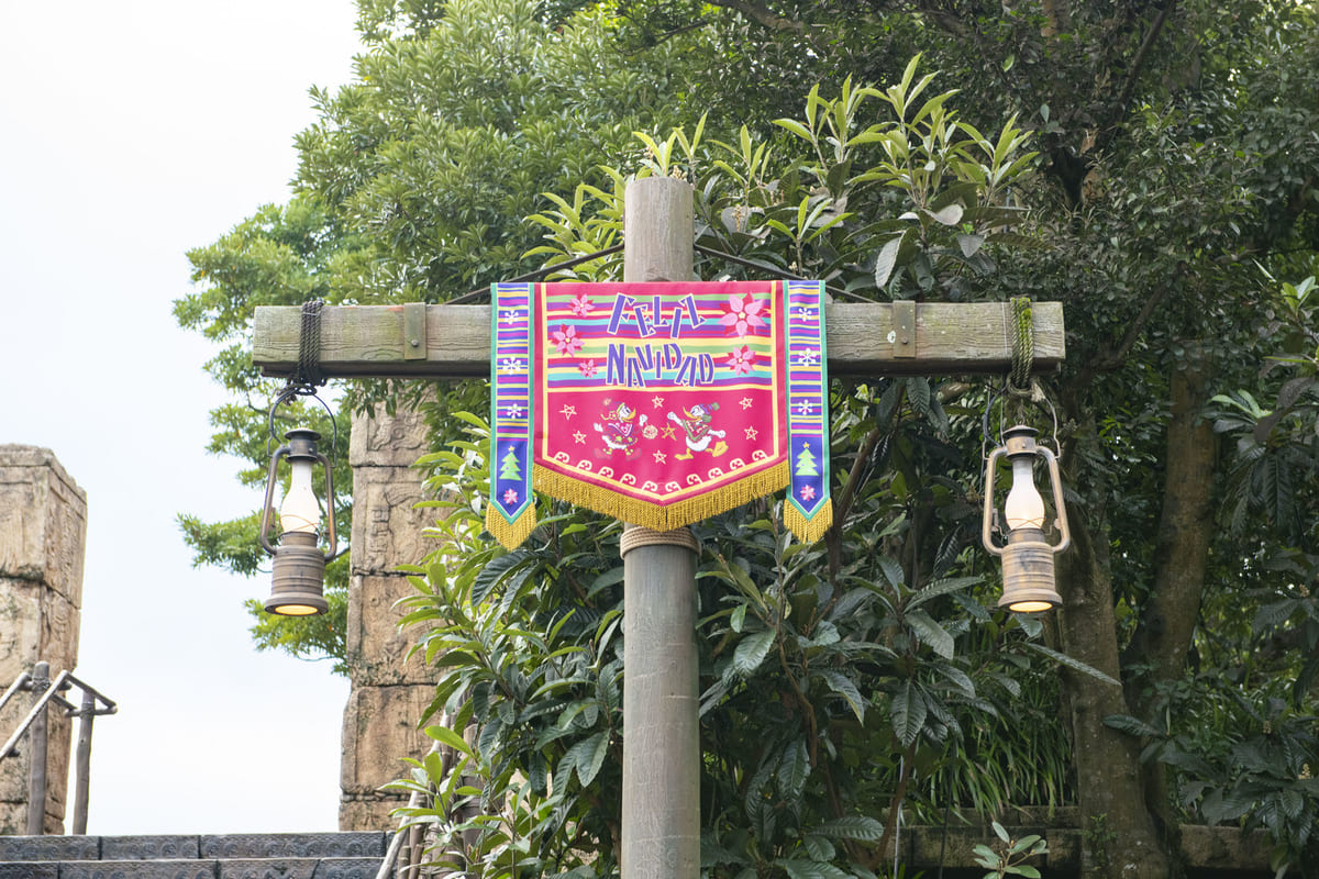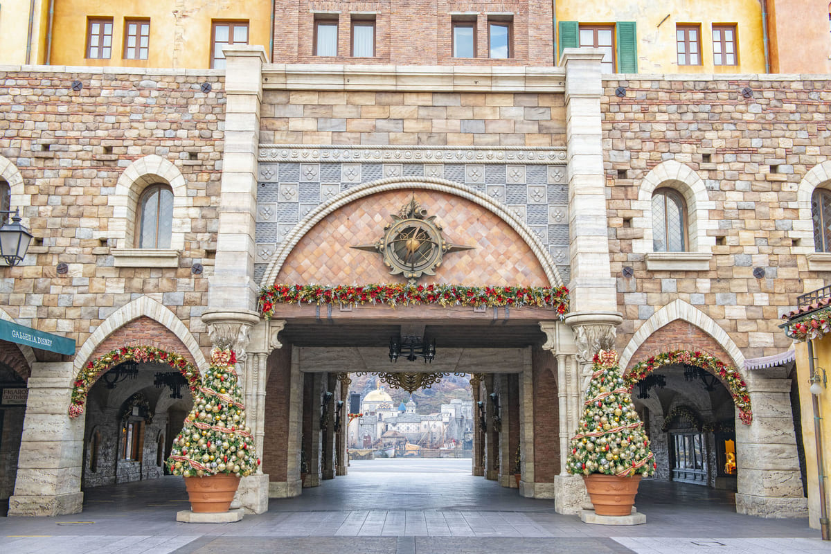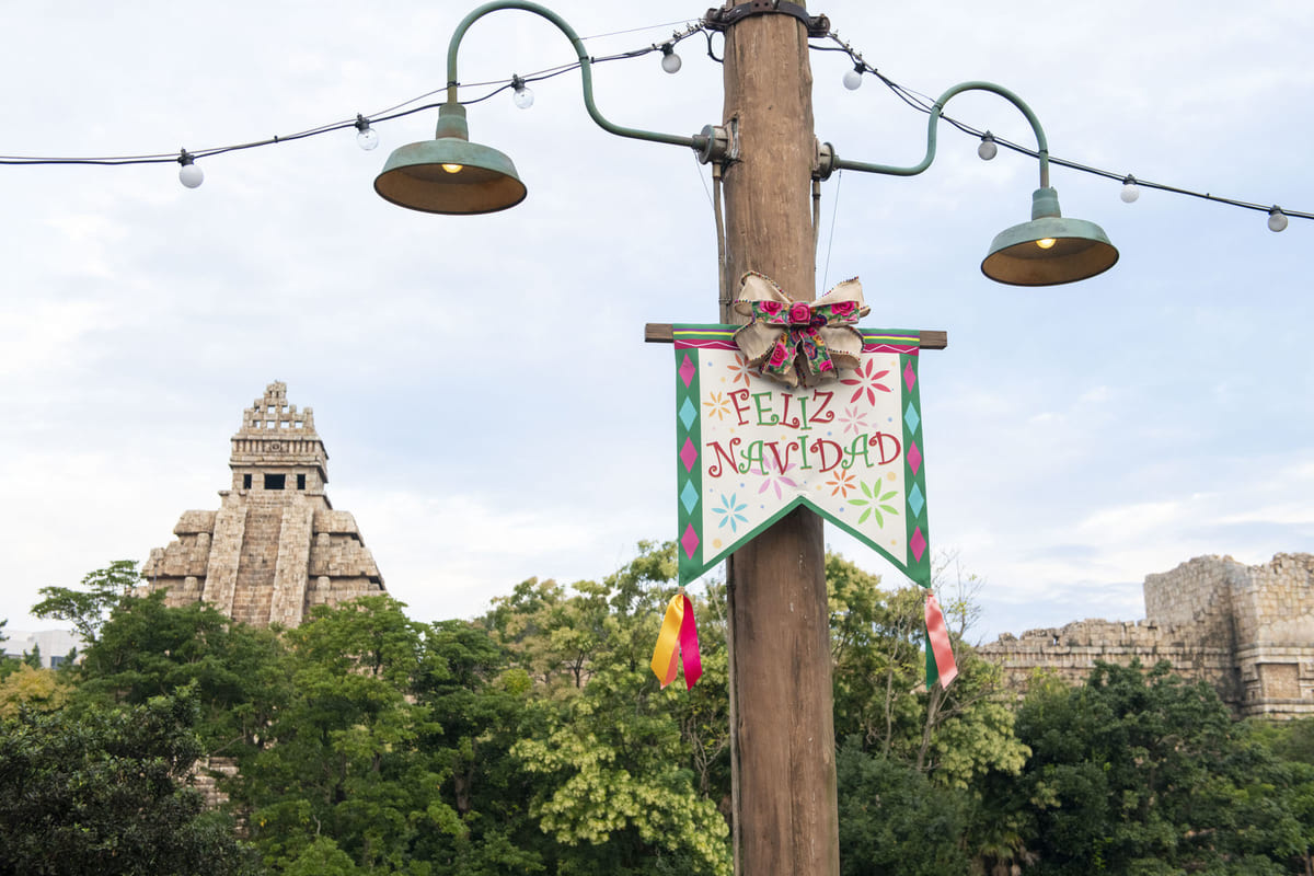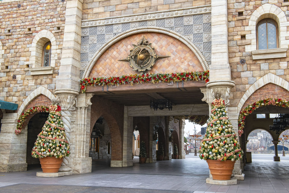 パークの中心部「メディテレーニアンハーバー」の外灯にもクリスマスカラーのデコレーションが施されています。
