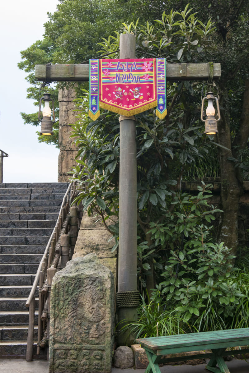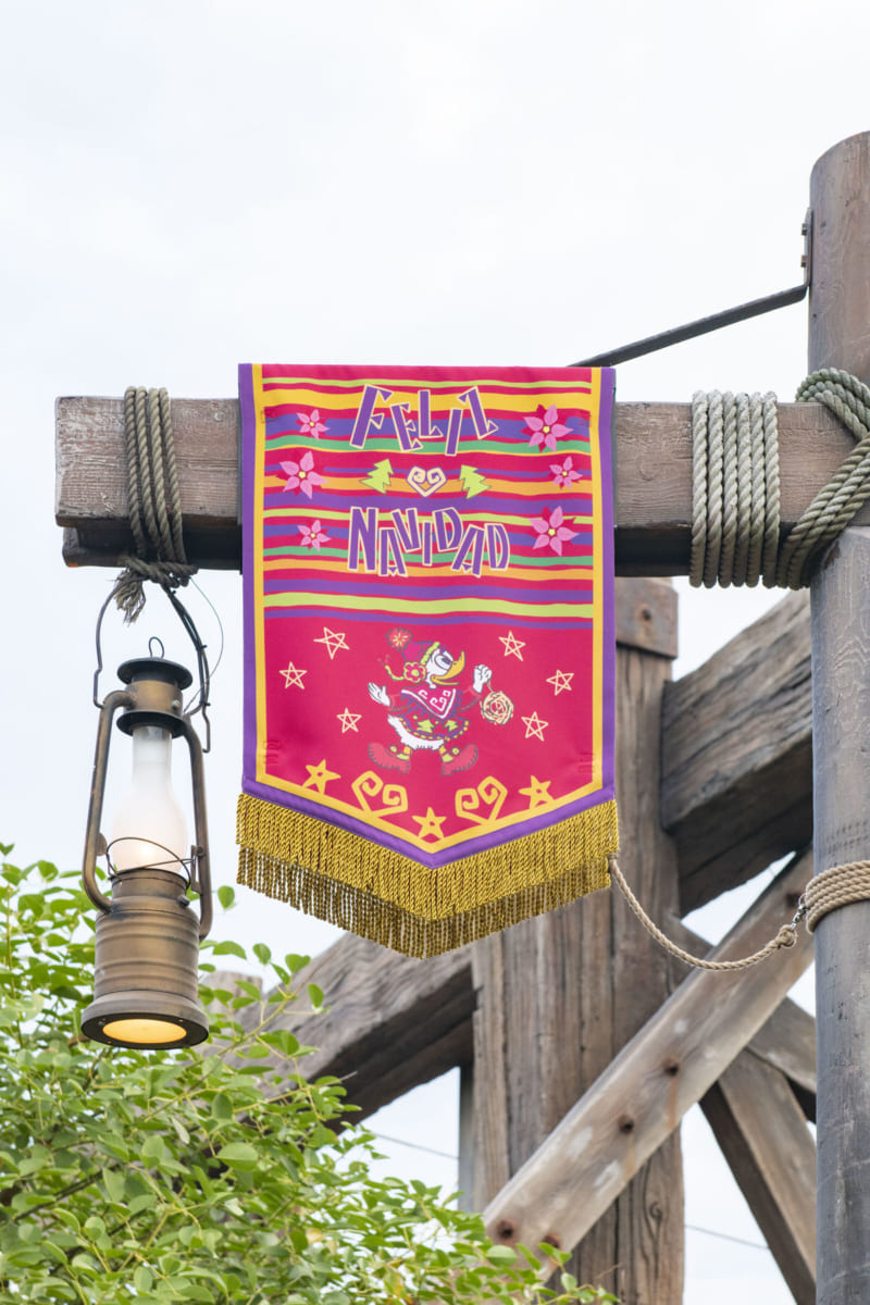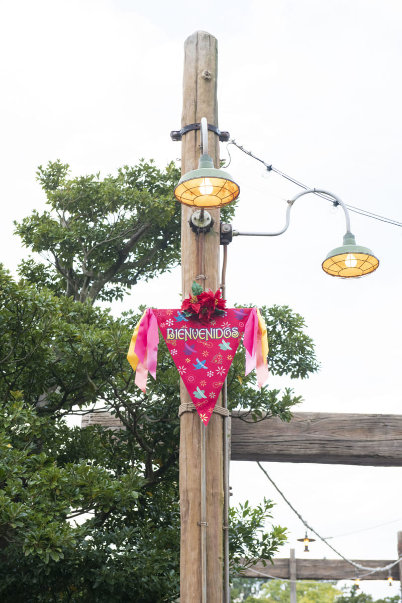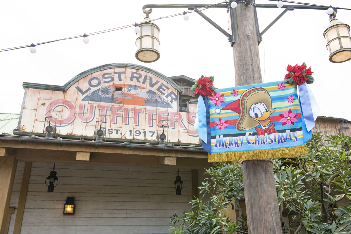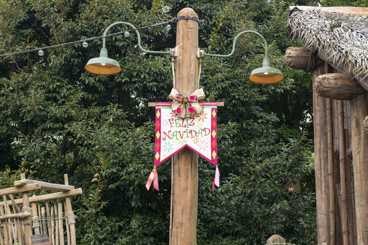 パークの中心部「メディテレーニアンハーバー」の外灯にもクリスマスカラーのデコレーションが施されています。