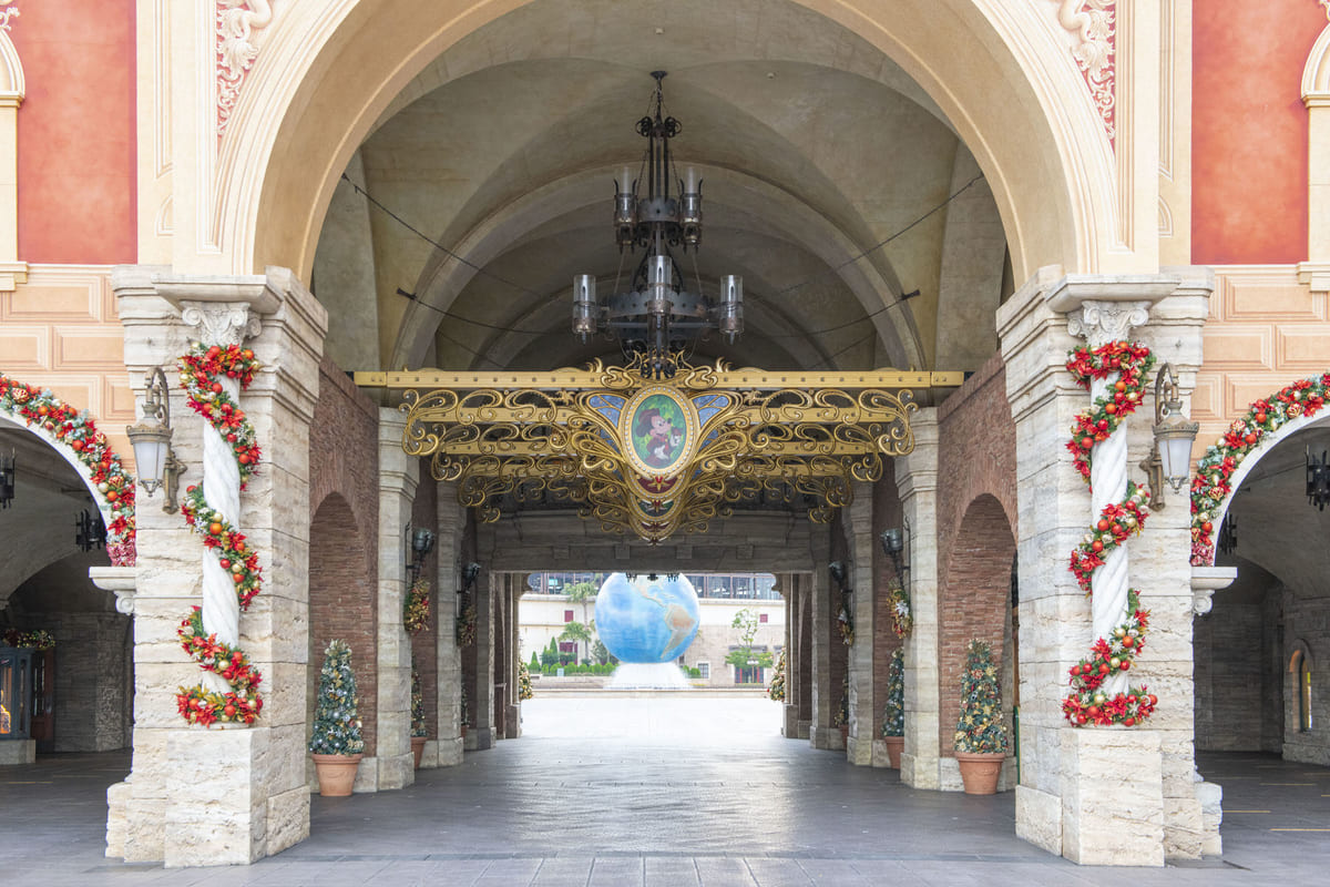 「アクアスフィア」のある「ディズニーシー・プラザ」から「メディテレーニアンハーバー」にかけて、華やかなデコレーションや光り輝くやイルミネーションが展開され、ゲストを華やかなクリスマスの世界へと誘います。