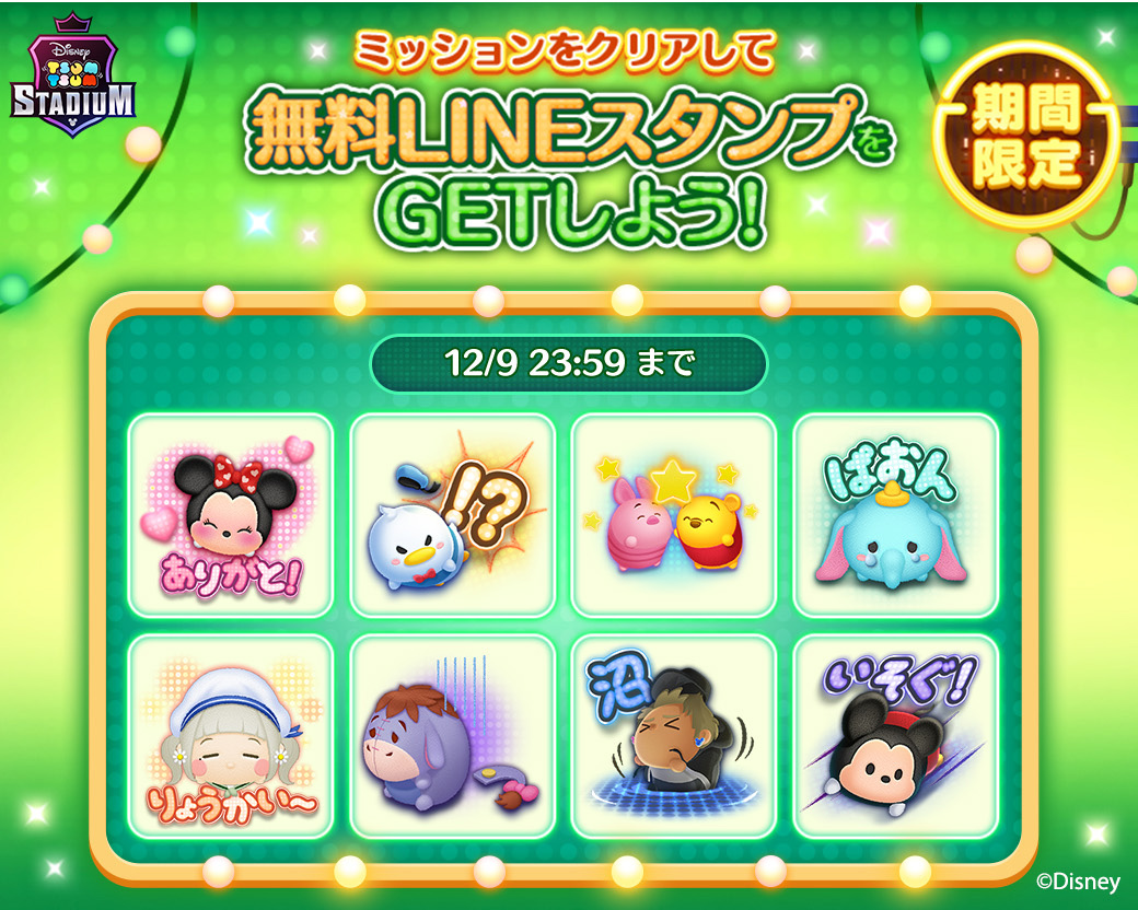2020年12月9日までの期間限定で実施されているLINE サバイバルパズルゲーム『ツムツムスタジアム』のLINEスタンプ無料配信の紹介でした☆