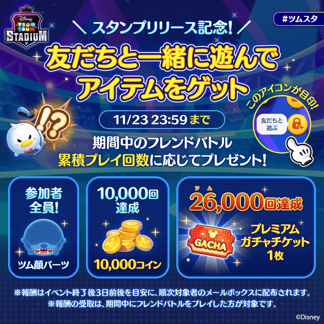 『ツムツムスタジアム』内から発行したURLを、友だちや仲間に教えると一緒にリアルタイム対戦ができる「フレンドバトル」をプレイするとアイテムがもらえるイベントです☆