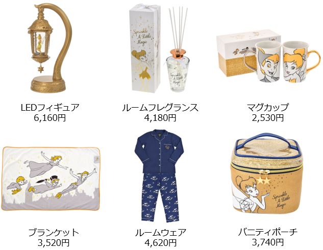 ぐっずには『ピーター・パン』に登場する「ティンカー・ベル」のピクシーダストをイメージし、ゴールドグリッターをデザインのアクセントに使用した、華やかな高級感あふれる雰囲気に仕上げられています。