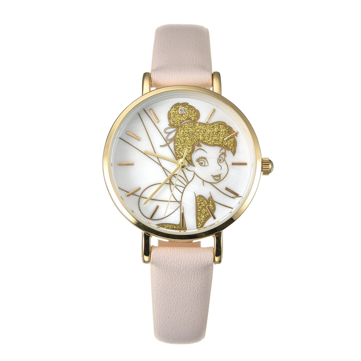 ゴールドに輝くキャラクターが大胆にデザインされた文字盤が魅力的な「ティンカー・ベル」の腕時計。