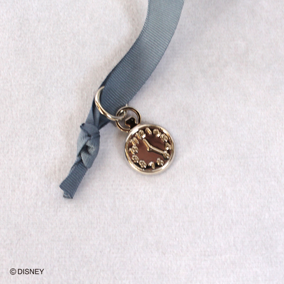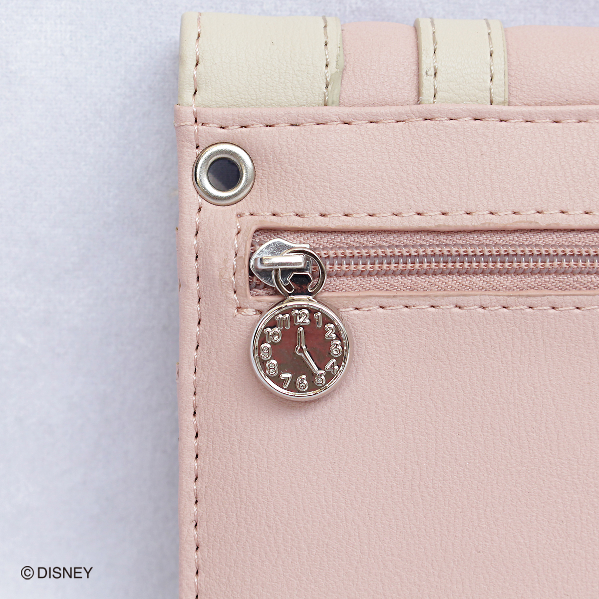 ファスナーの部分には時計のチャーム付き。
