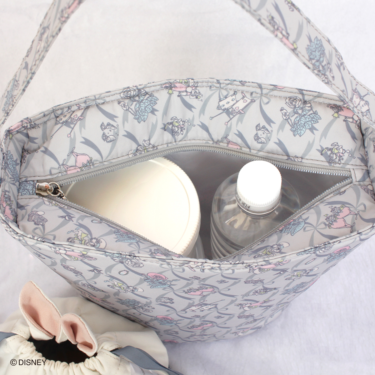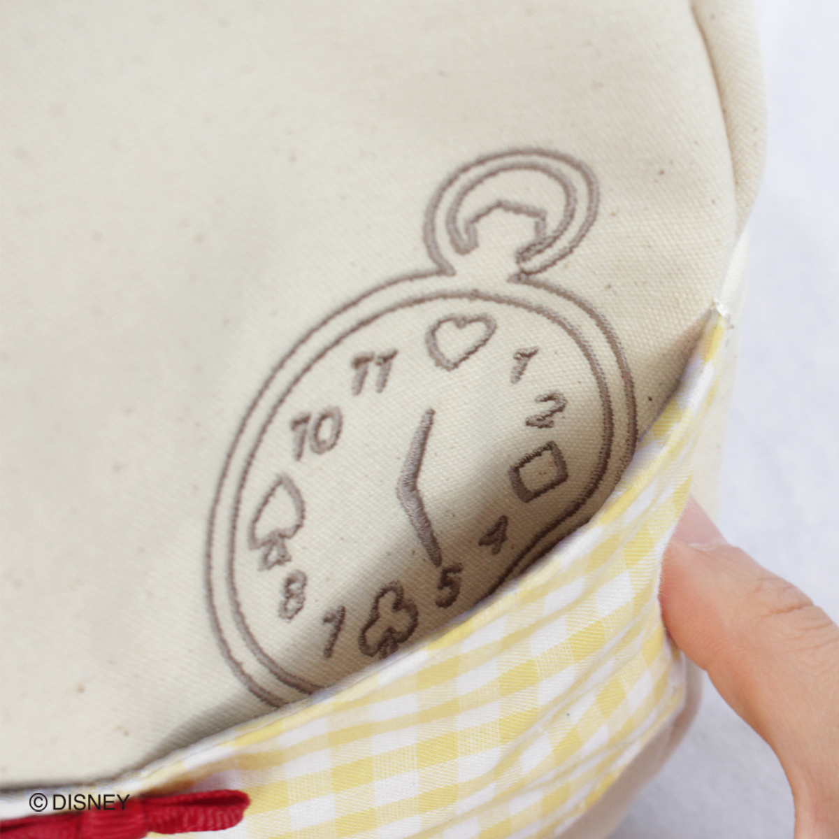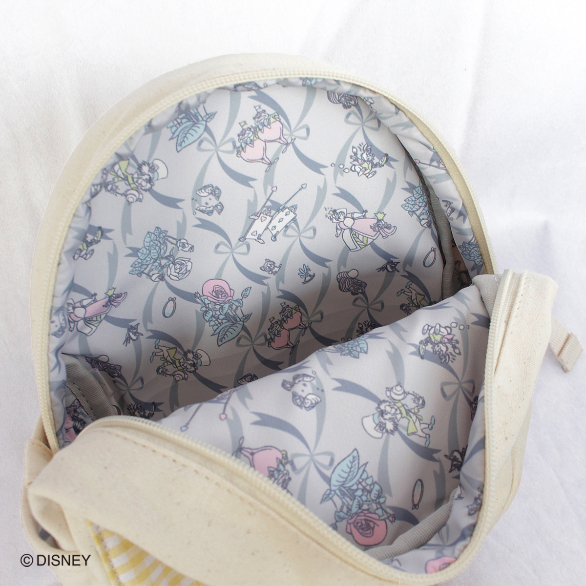 ポケットからチラリと見える懐中時計や、内側に限定ファブリックを使用したりと、細部までふんだんにアリスの世界観が散りばめられています。