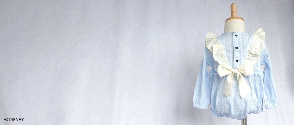 柔らかい色合いとコロンとしたフォルムがどこからみても愛らしい、「アリス」をイメージしたロンパース。