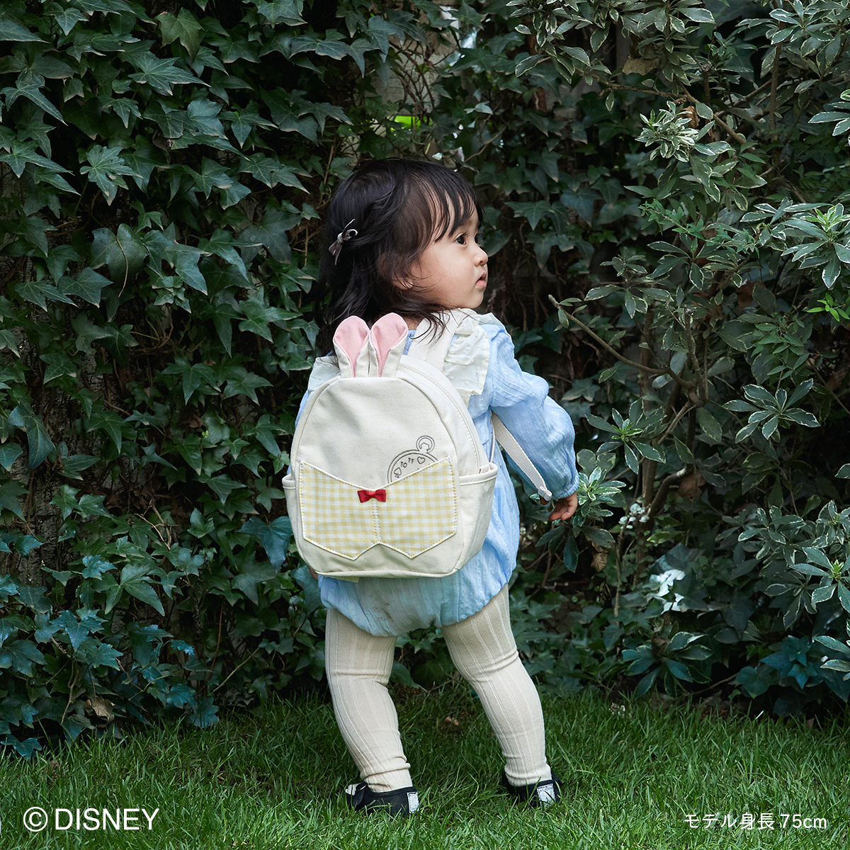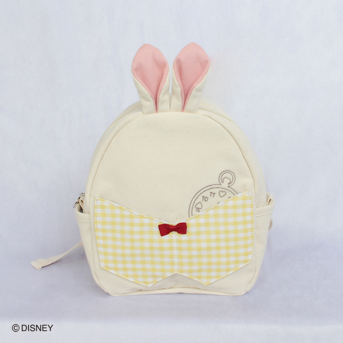 ピンと立った耳、蝶ネクタイ、ベストなど白うさぎのデザインが目を引くキッズリュック。