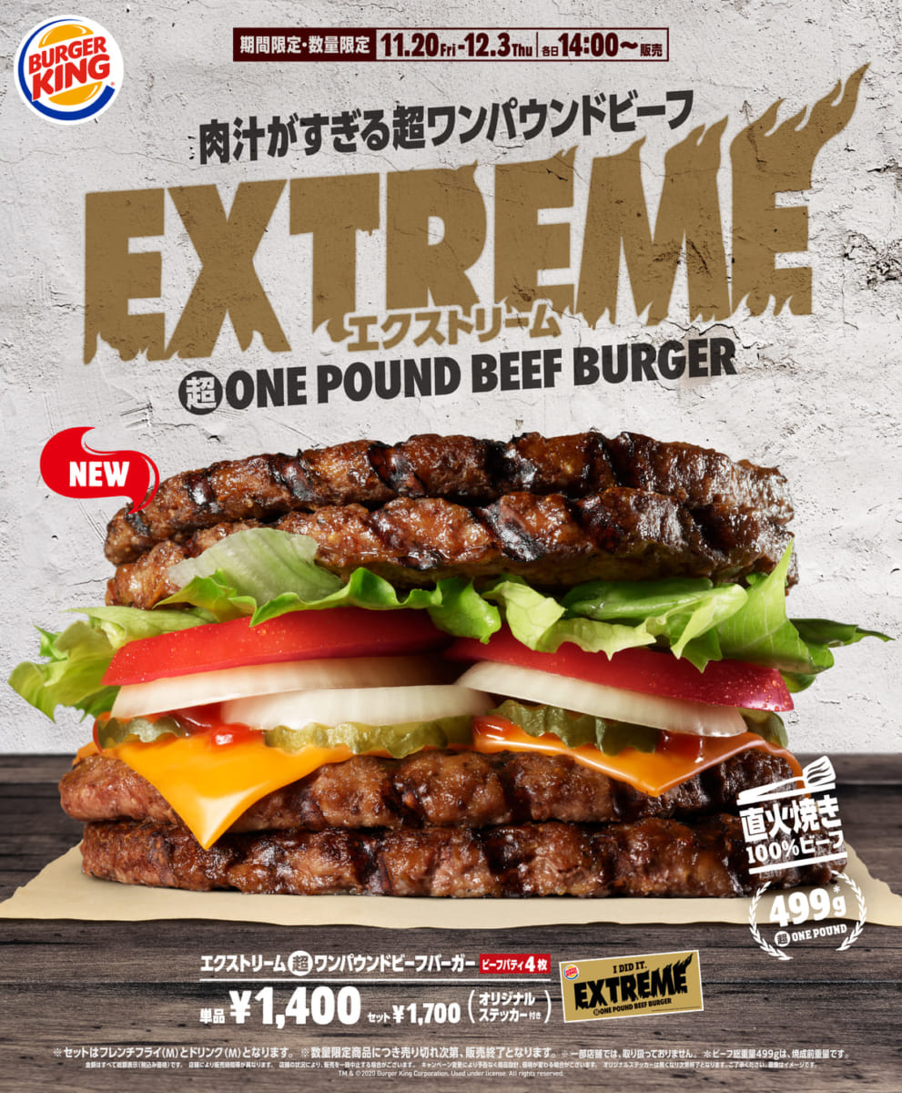 バーガーキングの「エクストリーム超ワンパウンドビーフバーガー」は2020年11月20日(金)~2020年12月3日(木)の期間限定販売です。