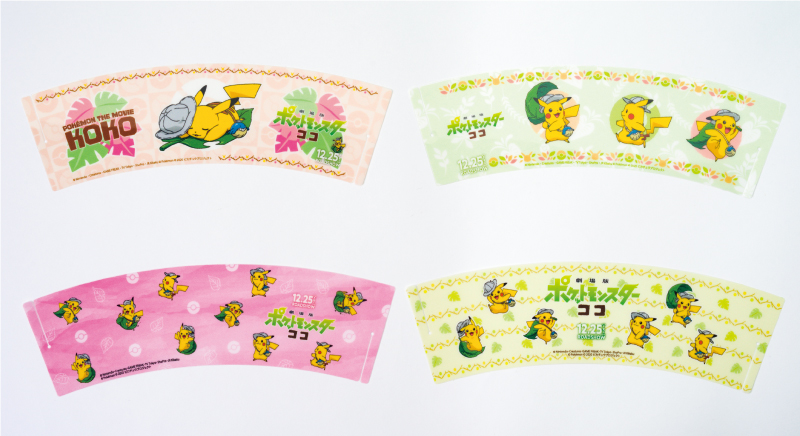 「飲めるプリン!?キャラメルピカピカフラッペ」には、『劇場版ポケットモンスター ココ』に登場する探検姿の「ピカチュウ」が描かれたスリーブが付いてきます。