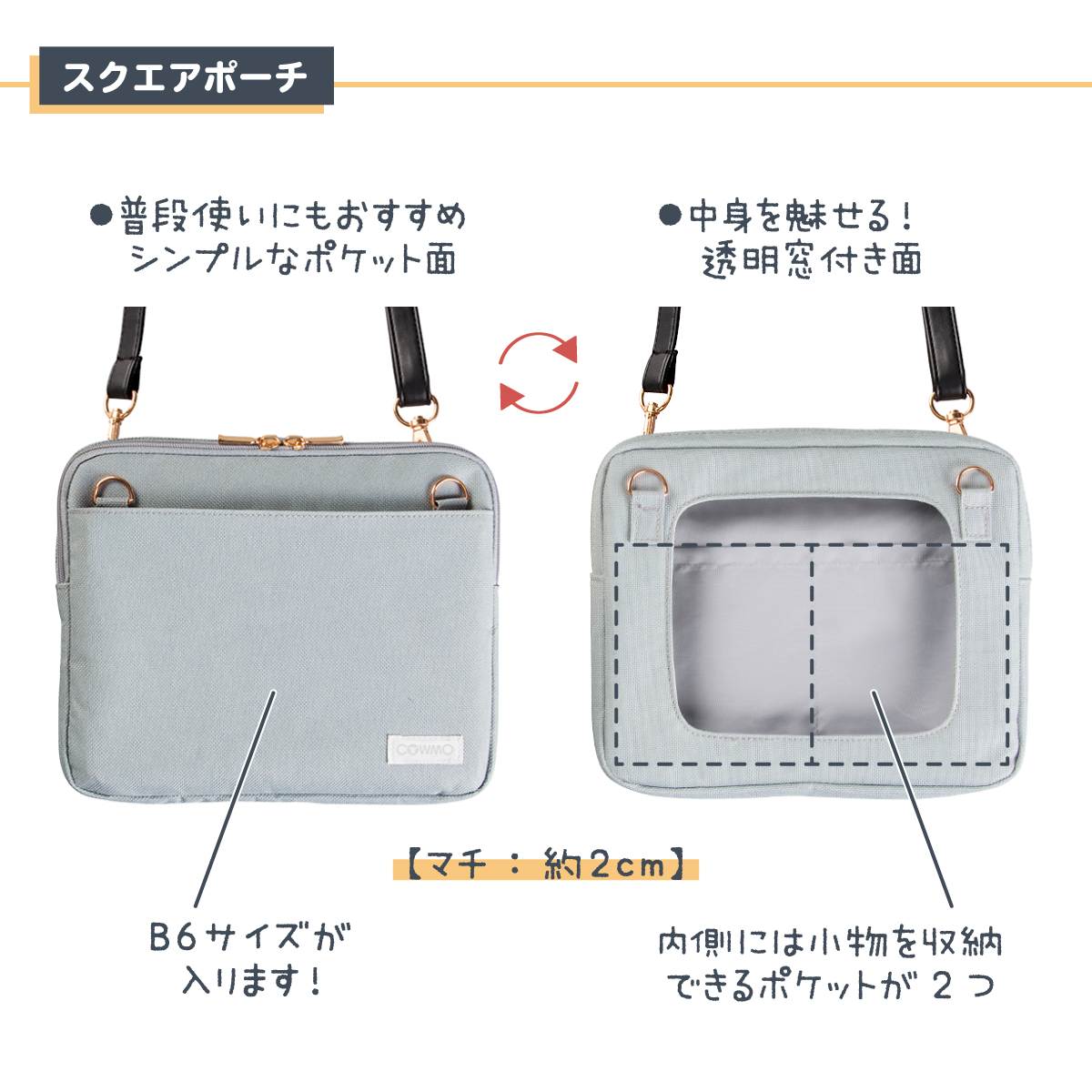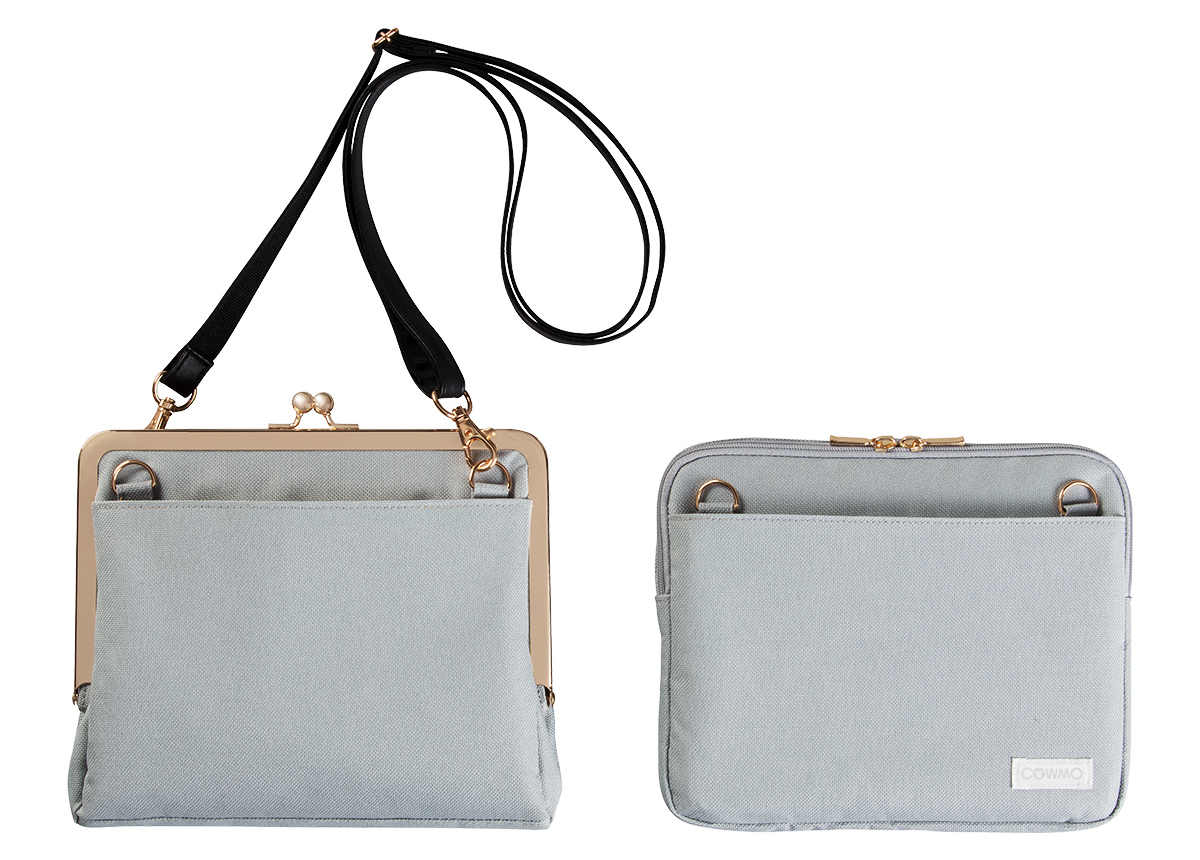 今回、第2弾として登場する「COWMO 財布ショルダーplus」は、スクエアポーチ・マチ付きがま口ポーチ・ショルダー紐の3点セット。