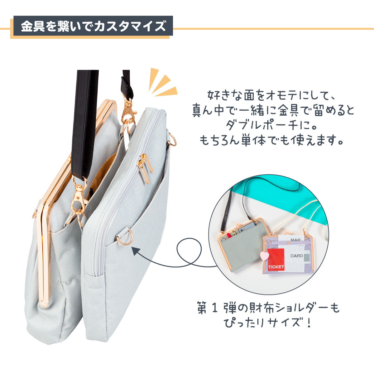 スクエアポーチとマチ付きがま口ポーチは、単品での使用はもちろん、金具で繋げてダブルポーチにもできます!