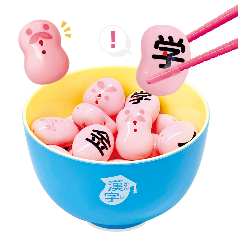 24個の豆ピースにはそれぞれ異なる漢字が書かれており、豆つかみゲームを通してお箸のマナーと一緒に漢字も身に着くゲーム。