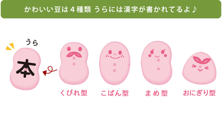 くびれ形、まめ形、こばん形、おにぎり形があり、表は可愛いお顔のデザイン!