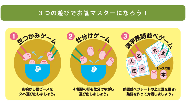 「豆つかみゲーム」、「仕分けゲーム」のほか、豆ピース裏の漢字を使った「漢字熟語並べゲーム」の3種類の遊び方ができます。
