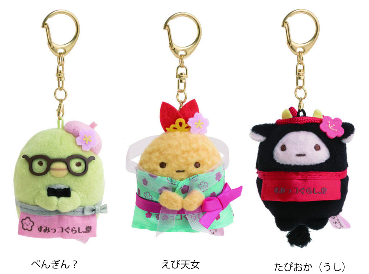 ぶらさげぬいぐるみ「ぺんぎん?」「えび天女」「たぴおか(うし)」が登場します。