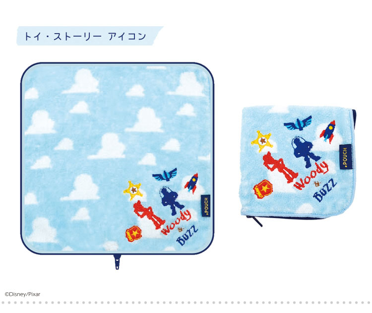 お馴染みの雲アイコンを背景に「ウッディ」と「バズ」のシルエットが刺しゅうされた、お洒落で爽やかなポーチです☆