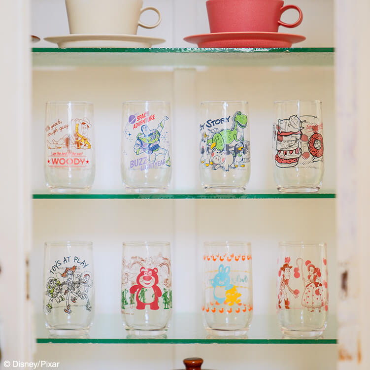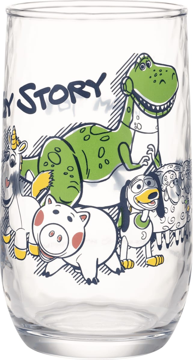「レックス」を中央に「バターカップ」や「ハム」「スリンキー・ドッグ」「ビリー、ゴート、グラフ」が描かれたグラス