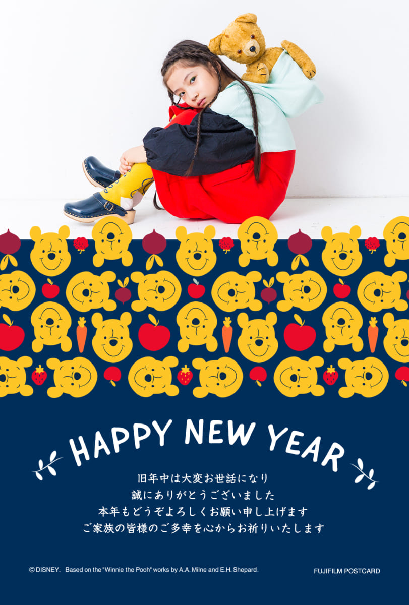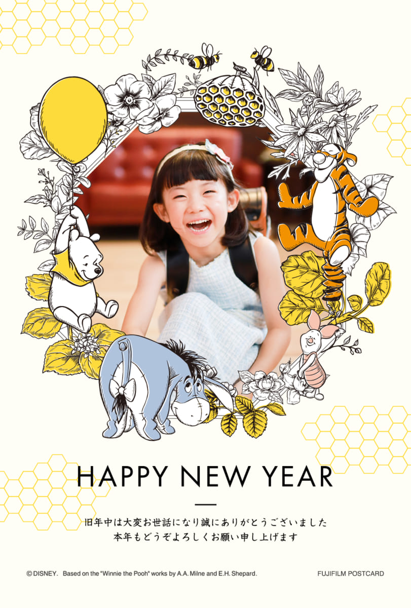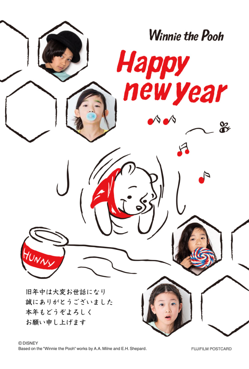 「くまのプーさん」デザインは、ハチミツが大好きな「プーさん」らしいキュートな年賀状ばかり。