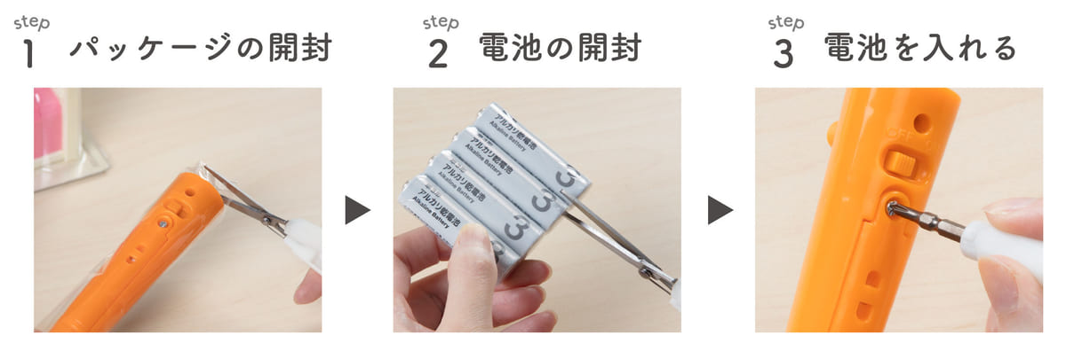 電池交換時には、破きにくい電池パッケージをはさみでカット。