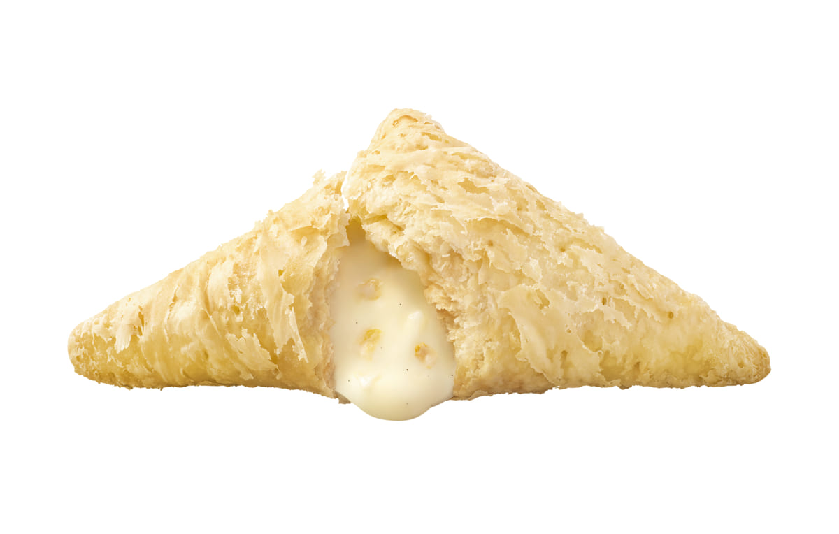 ホワイトチョコを練り込んだパイ生地とミルク風味のバニラクリームソースがスイートな「三角チョコパイ」初のバニラ味。
