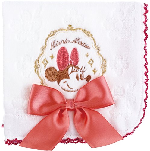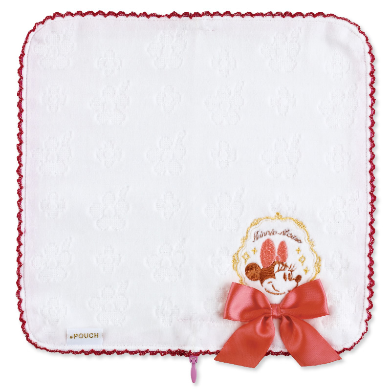 ホワイトのタオルを上品なレッドで縁取りした、「ミニーマウス」デザインの「どっとポーチ」