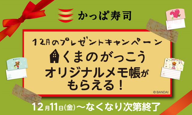 かっぱ寿司の『くまのがっこう』メモ帳プレゼントキャンペーンは、2020年12月11日(金)より開催です!