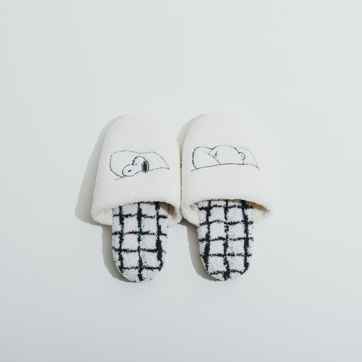 足をふんわり包み込んでくれるようなもこもこの生地に「スヌーピー」と「チャーリー・ブラウン」のおやすみシーンを片足ずつデザイン。