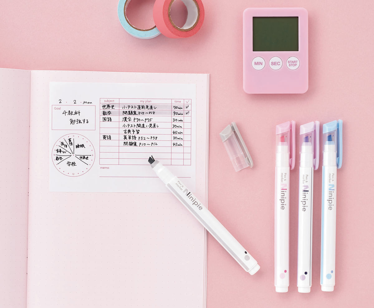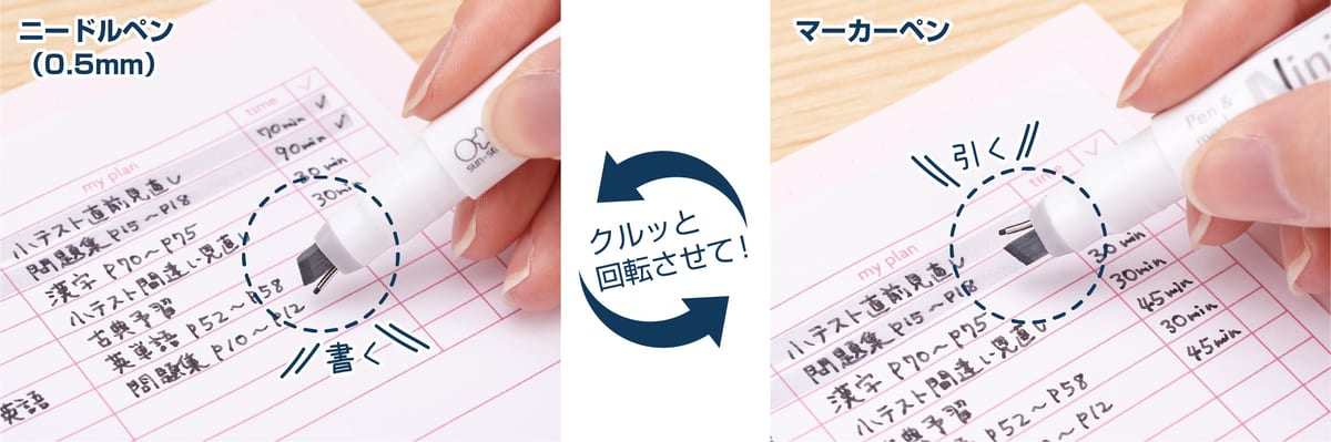 ペン先は、細かい文字が書きやすいニードルペン(0.5mm)と大事なところを目立たせることができるマーカーペンの2種類が一体化しています。