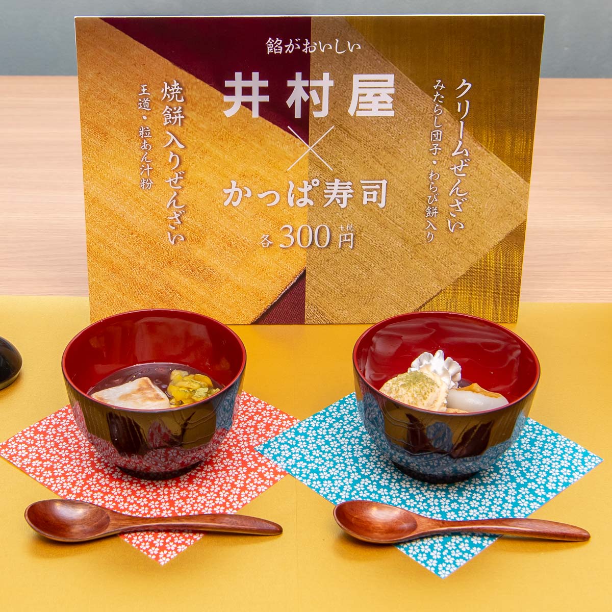 井村屋×かっぱ寿司「焼餅入りぜんざい -王道・粒あん汁粉-」「クリームぜんざい -みたらし団子・わらび餅入り-」