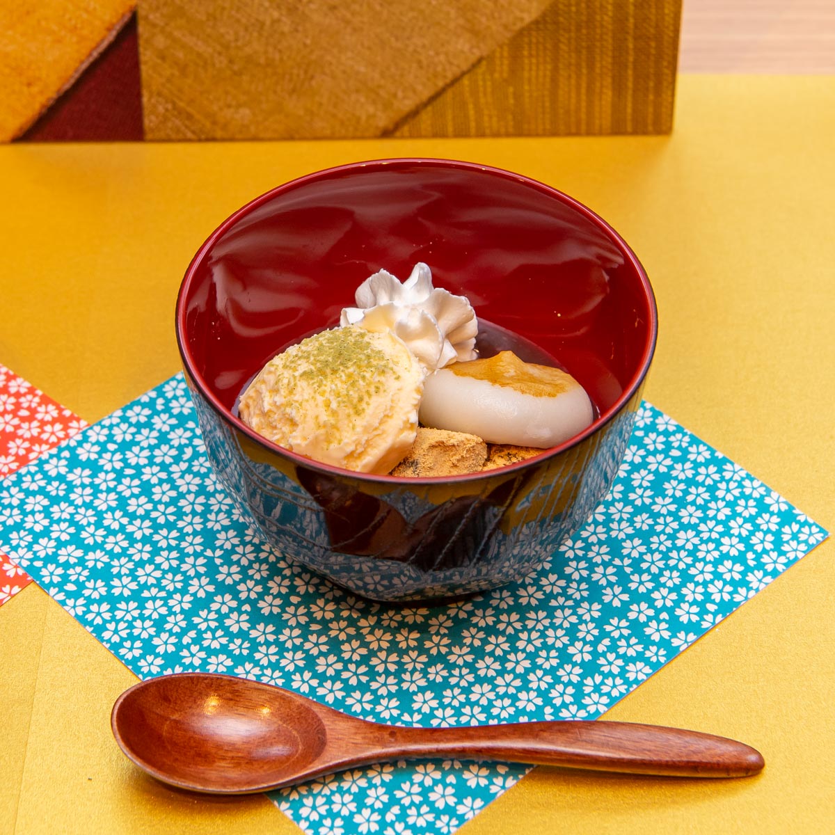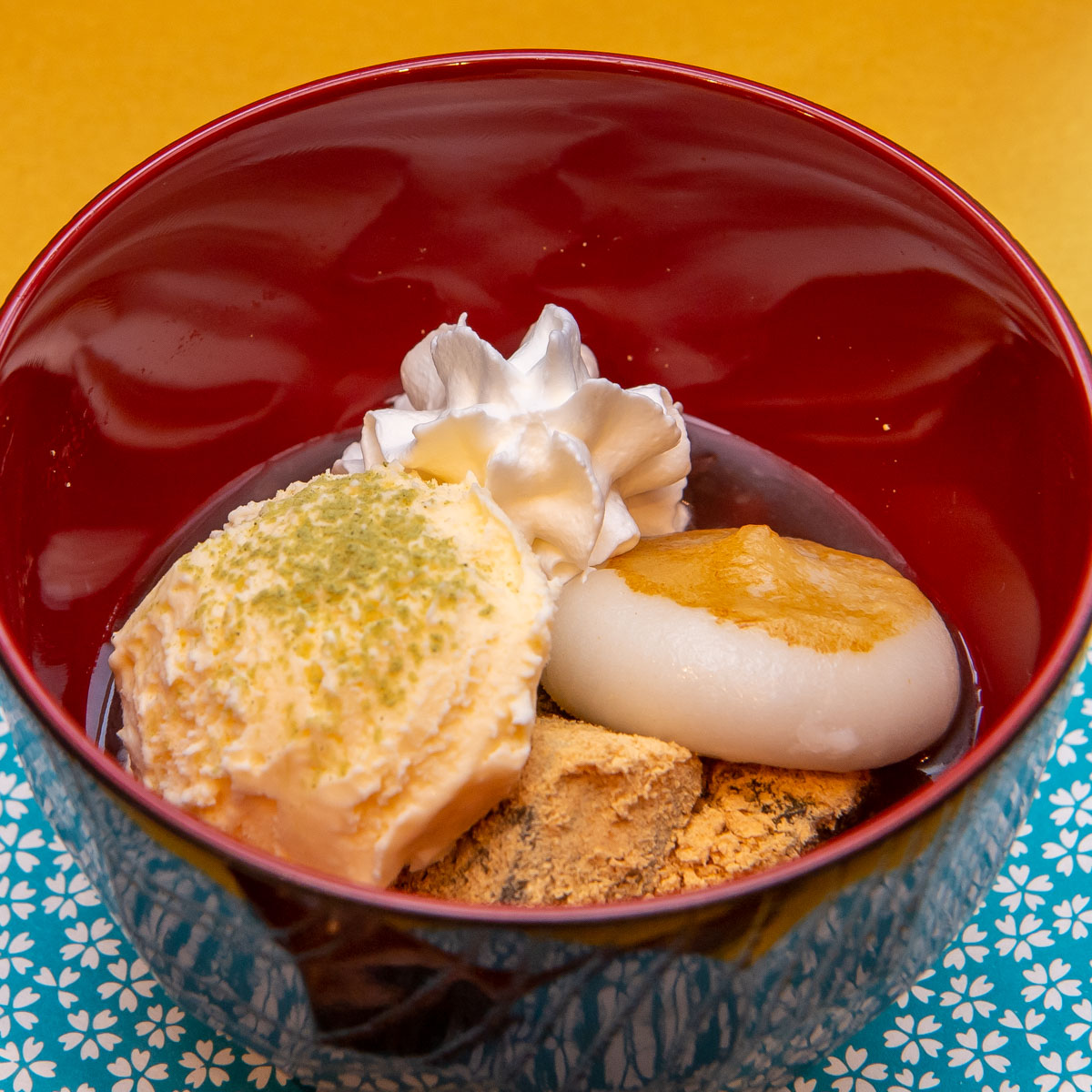 バニラアイスとホイップクリーム、さらにみたらし団子、黒糖わらび餅が乗った贅沢なクリームぜんざい。