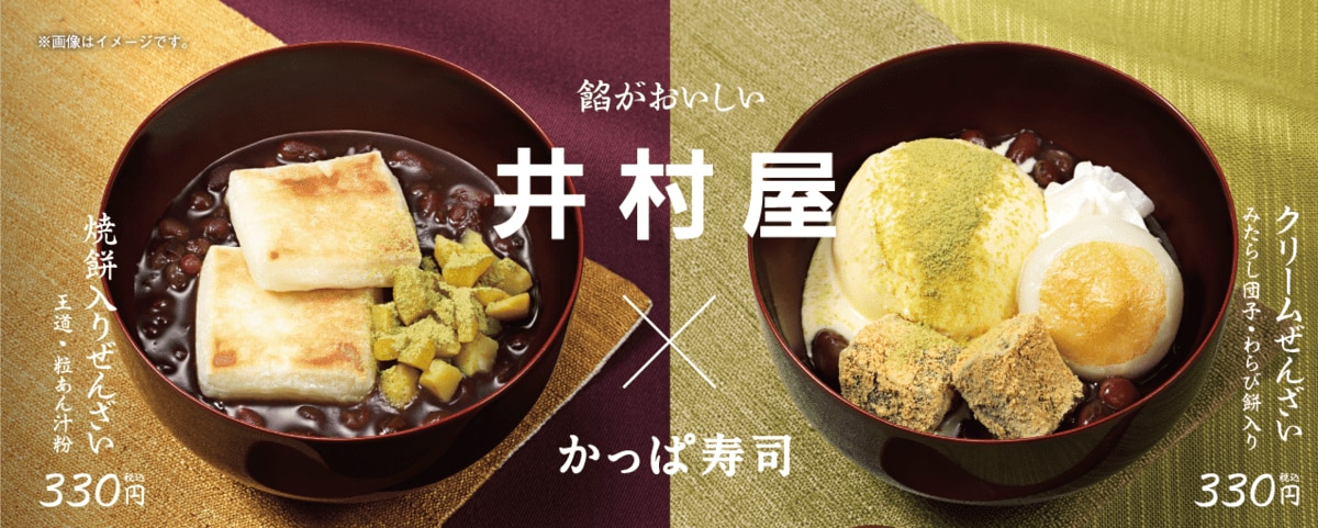 かっぱ寿司に、井村屋とコラボした和スイーツ「焼餅入りぜんざい -王道・粒あん汁粉-」「クリームぜんざい -みたらし団子・わらび餅入り-」が登場!