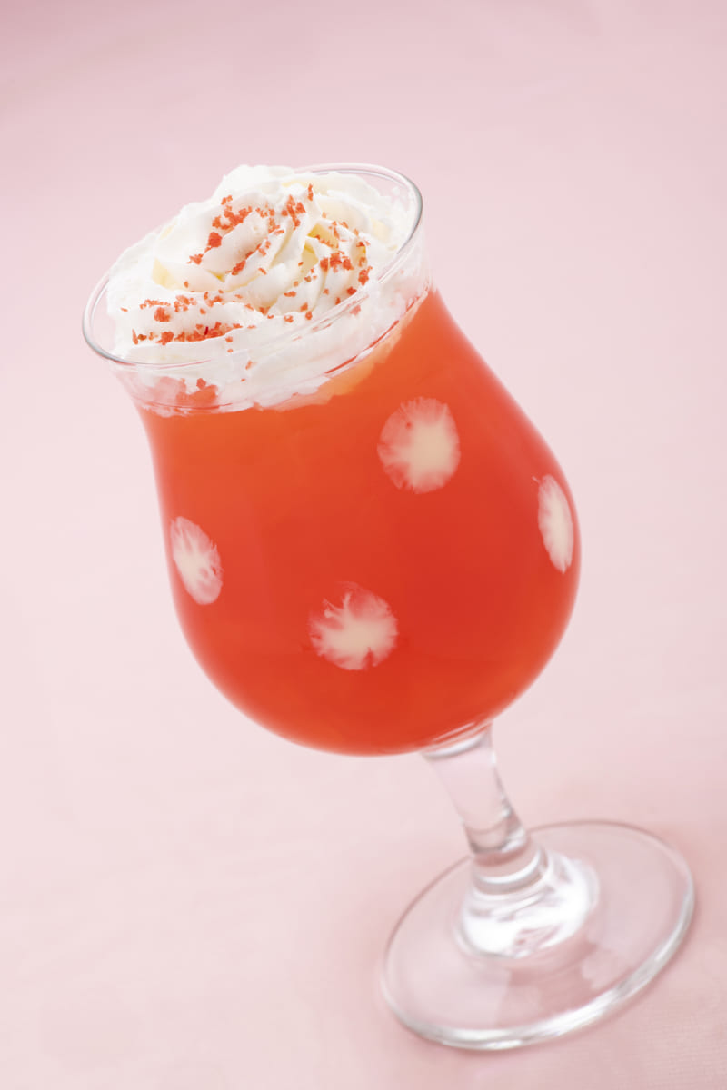 ブラッドオレンジシロップ、パッションフルーツシロップ、オレンジジュース、チョコレート、ホイップクリーム、ストロベリーパウダー