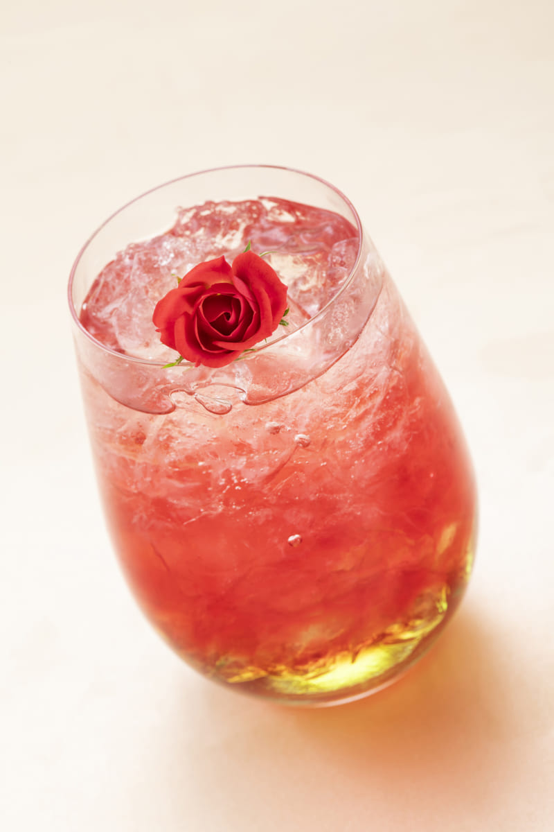 ランチ、ディナータイムどちらでも味わえる、ベルローズを散らしたスペシャルドリンク。