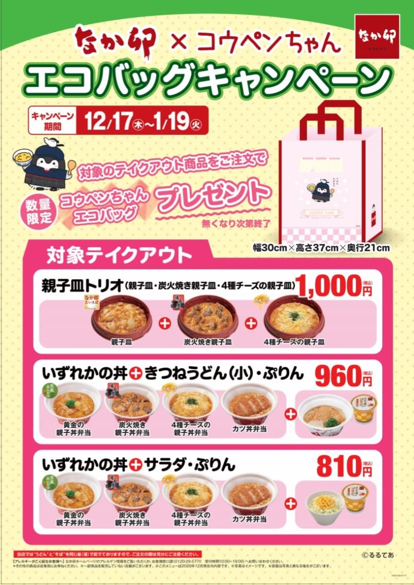 対象商品をテイクアウトで注文すると、「なか卯」のユニフォーム姿がかわいい「コウペンちゃん」のエコバッグがもらえるキャンペーンがスタートします☆