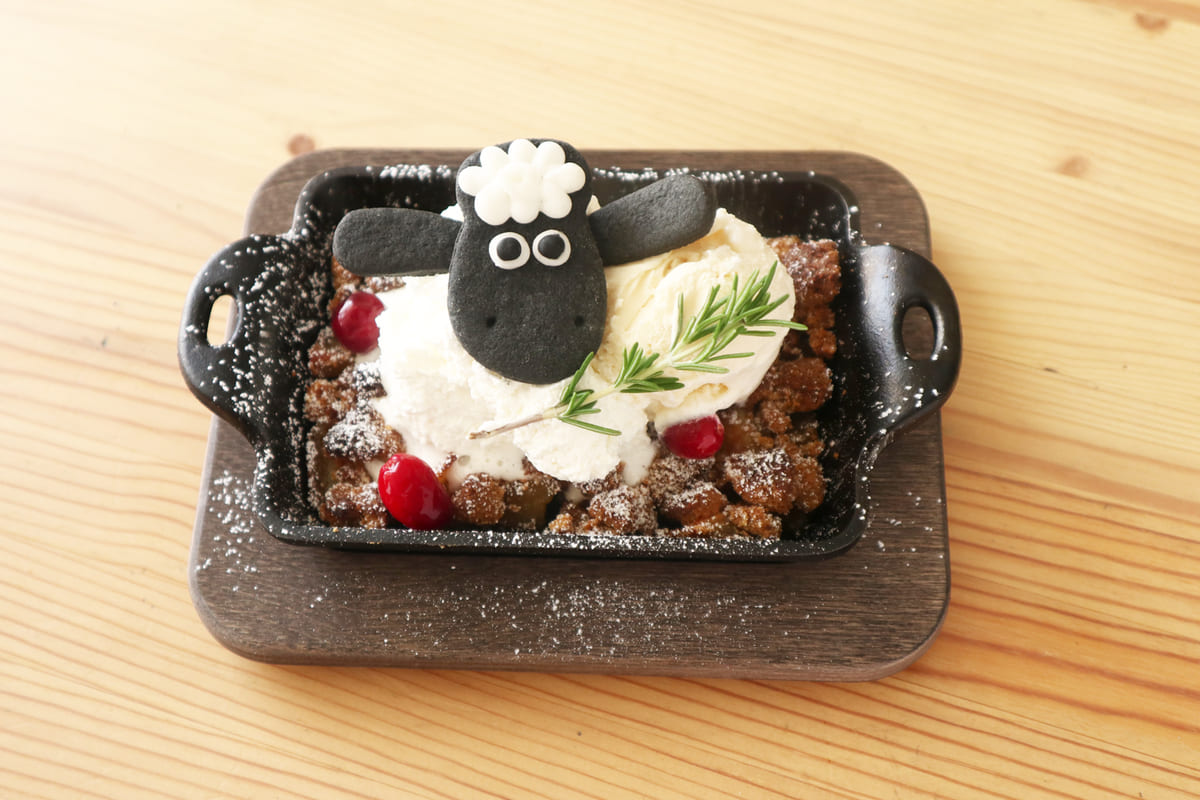 「ショーン」の形をしたワッフルには、クリームとメープルシロップが添えられ、食べるのがもったいなく感じてしまいそうです☆