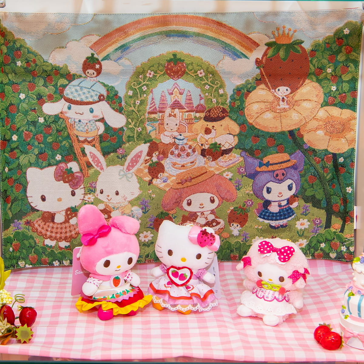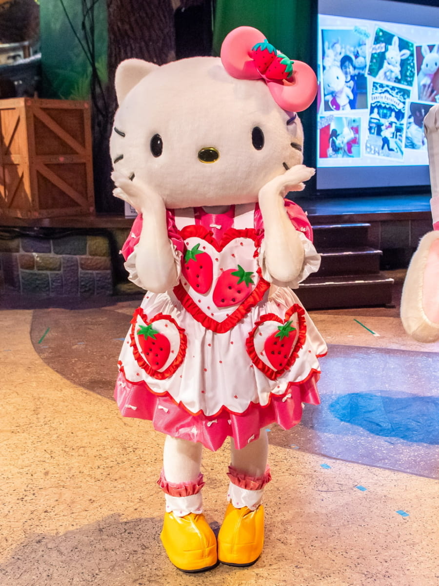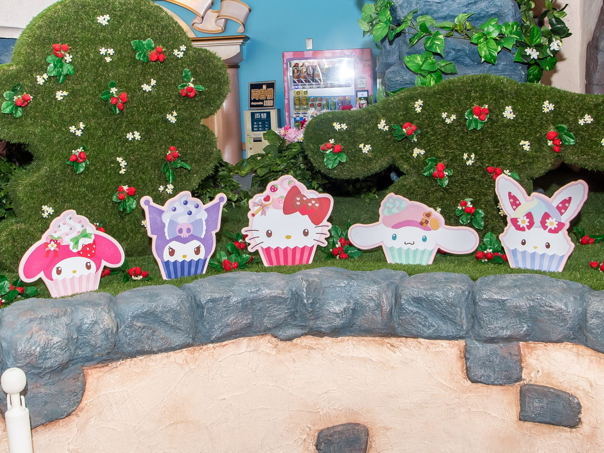 いちご農園をイメージした装飾をバックに実施されるので、いちご狩りを楽しむキャラクターの姿を見ることもできます。