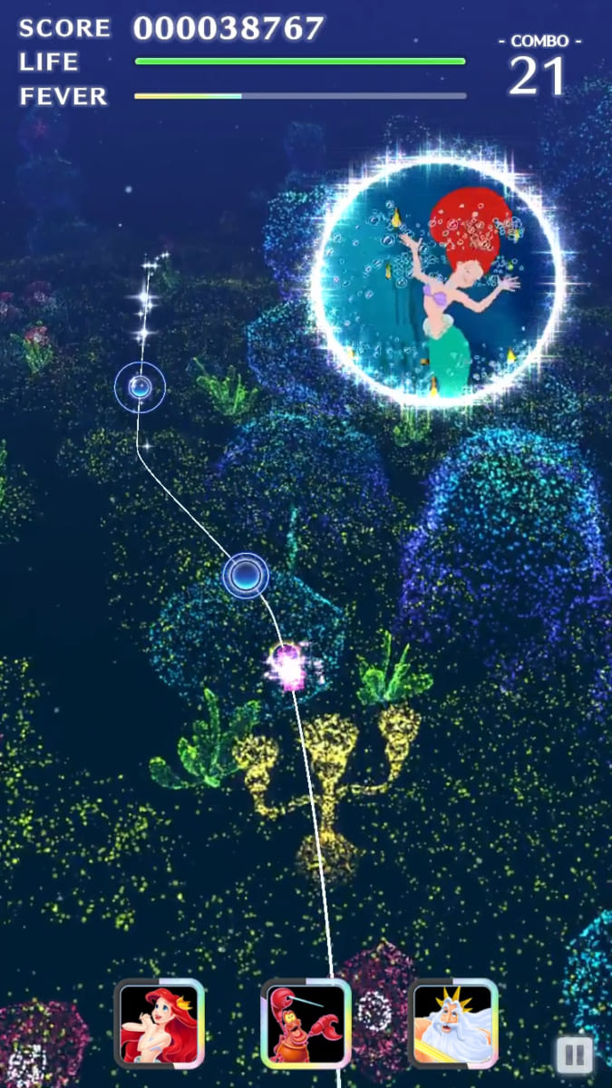 『ディズニー ミュージックパレード』は、ディズニーの音楽とともに、イルミネーションのような3D空間で再現されたディズニー作品の名場面をかけめぐる音楽ゲームアプリ。