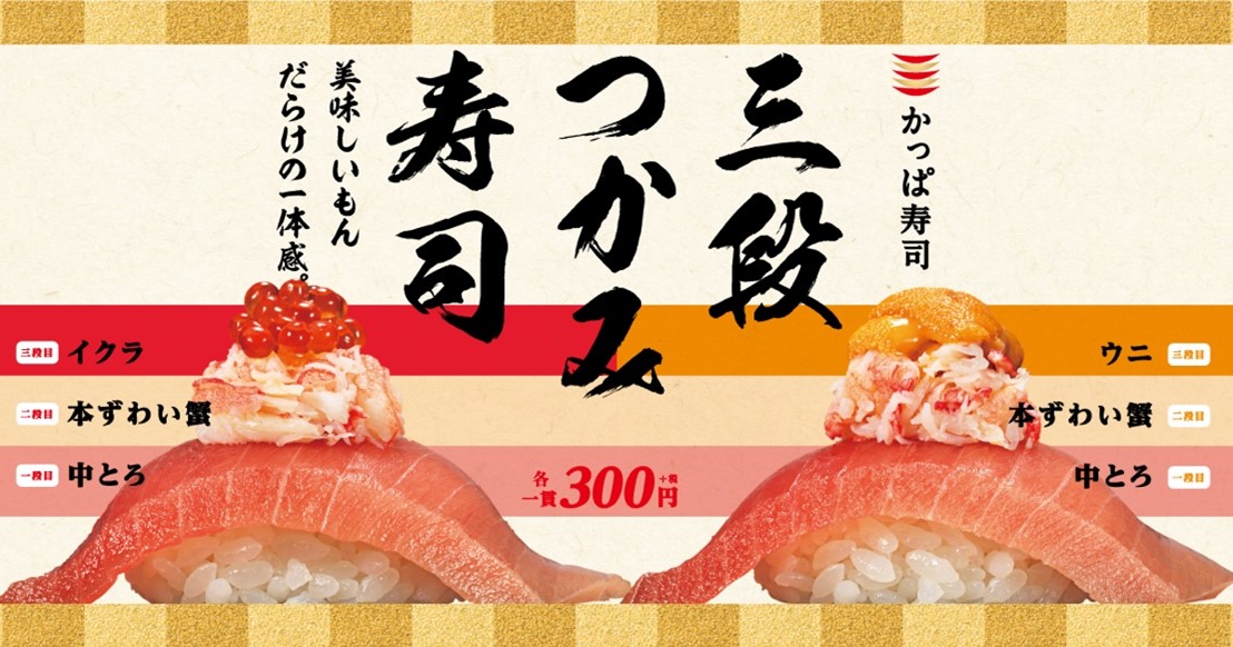 かっぱ寿司の「三段つかみ寿司」は、2020年12月23日~2021年1月11日まで数量限定販売です。