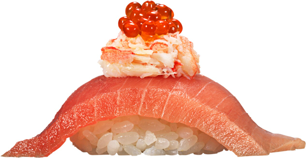 かっぱ寿司こだわりの「本ずわい蟹」を「中とろ」の上に重ね、「イクラ」をトッピング!