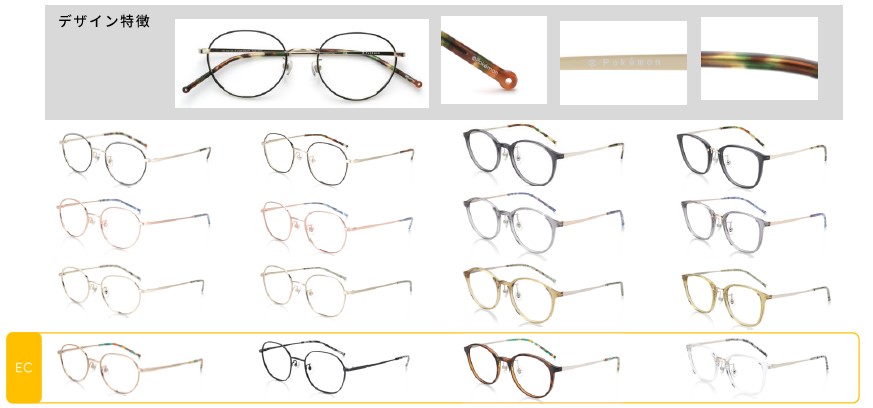 メタルとコンビネーションの軽やかな印象のフレームに、それぞれのポケモンのイメージカラーが落とし込まれています。