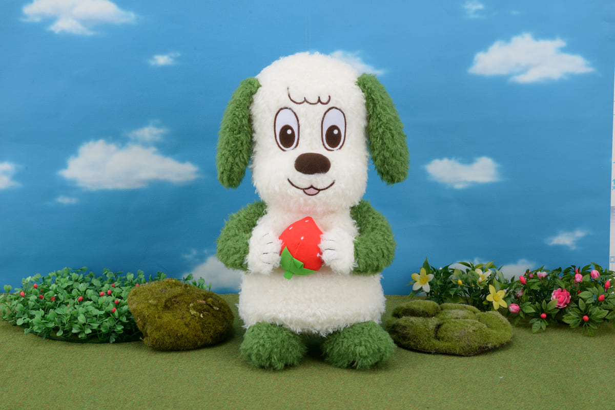 いちごを持った、かわいい「ワンワン」のぬいぐるみです。