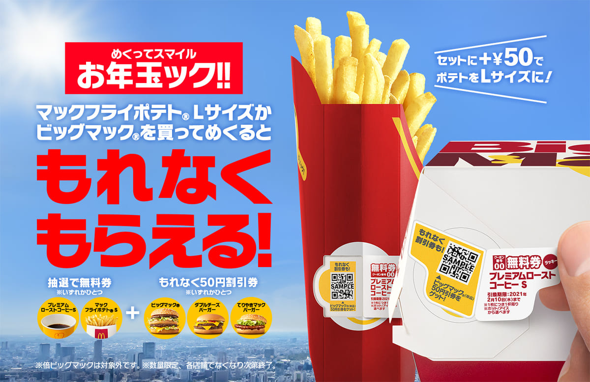 期間中に購入された「ビッグマック」か「マックフライポテトLサイズ」のパッケージをめくると、抽選で無料券(「プレミアムローストコーヒーS」または「マックフライポテトS」)が当たり、さらにもれなく50円割引券(「ビッグマック」、「ダブルチーズバーガー」、「てりやきマックバーガー」のいずれか1つ)がもらえます☆
